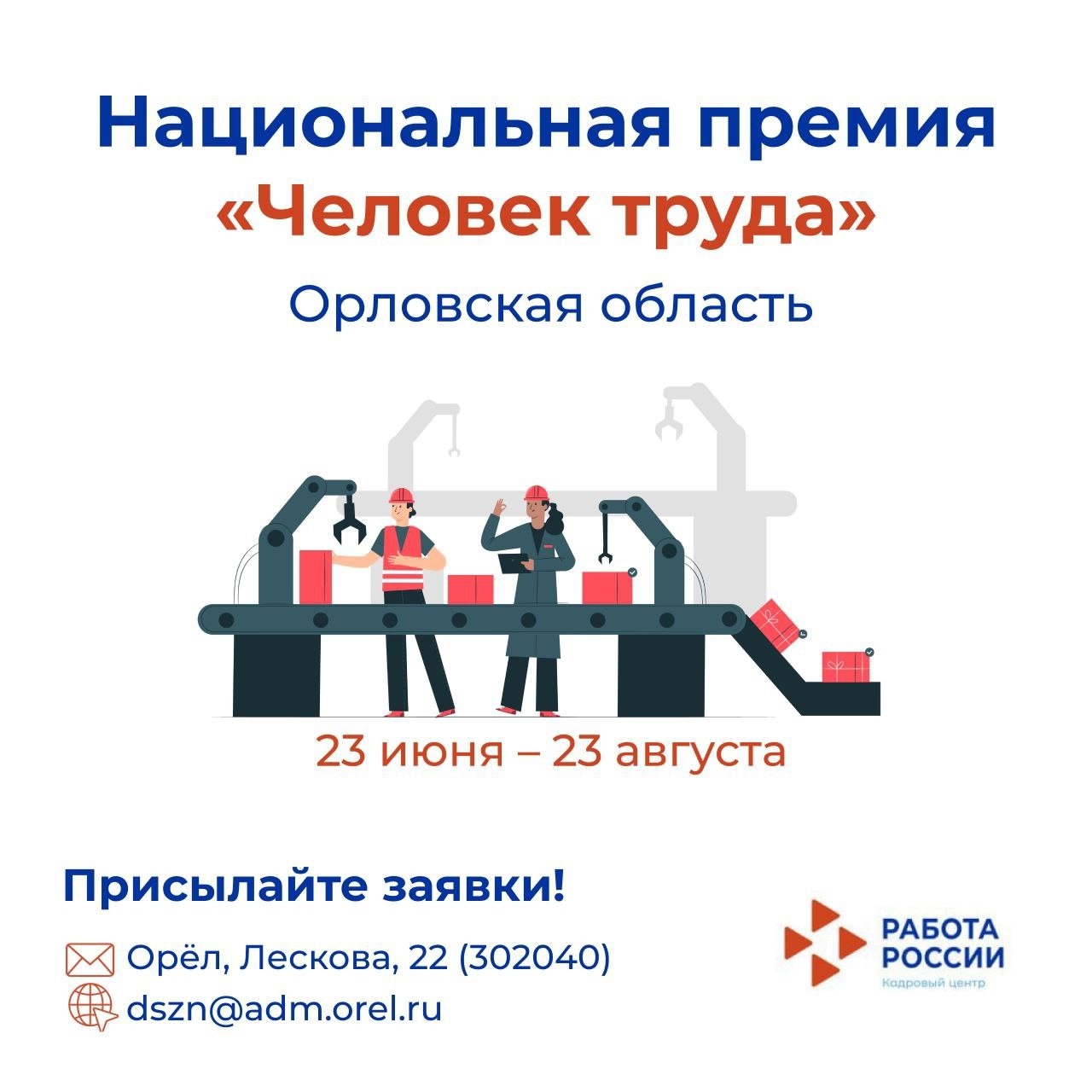 Заявки на участие сотрудников в премии направляются по адресу: 302040, г. Орёл, ул. Лескова, 22 или по эл. почте dszn@adm.orel.ru с 23 июня 2025 года по 23 августа 2025 года. Они должны содержать подробную информацию о достижениях кандидатов, их вкладе в развитие отрасли и профессиональных успехах.